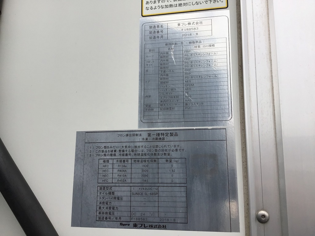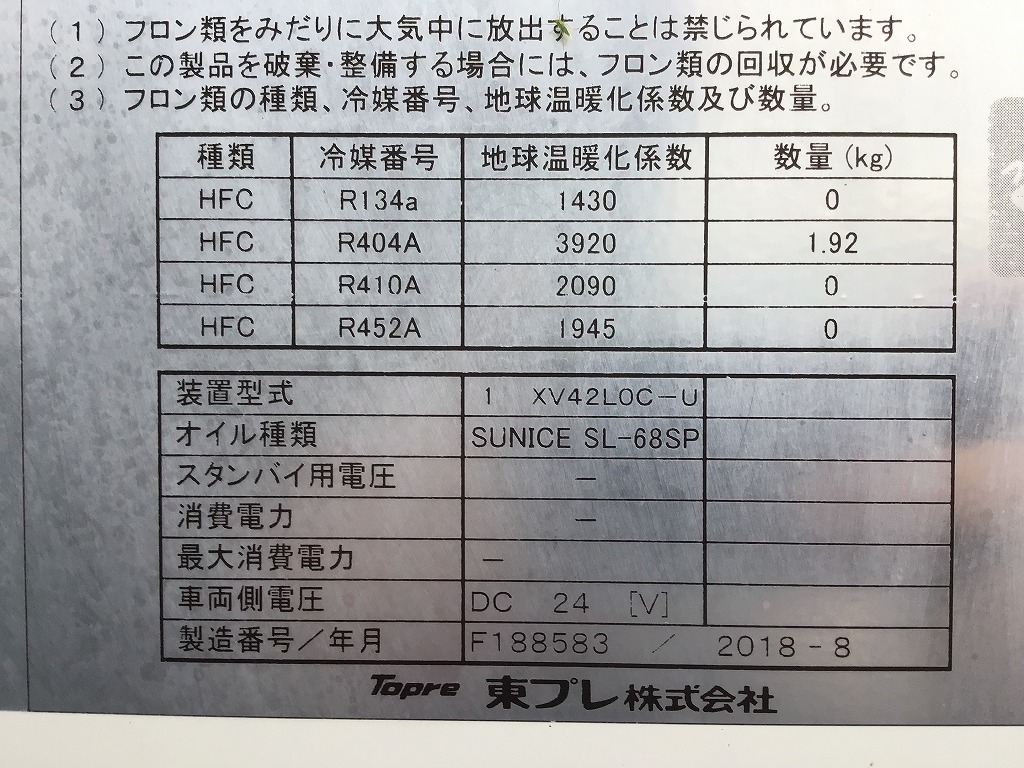 東プレ製XV42LOC-U型 -30度設定 サイドドア(助観音)床キーストン E/G始動時1時間で26度~-1度まで確認済み 上物年式2018年8月 キャブペイント アルミホイール バックモニター 電格ミラー キーレス付 ベッド付