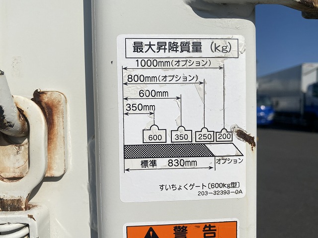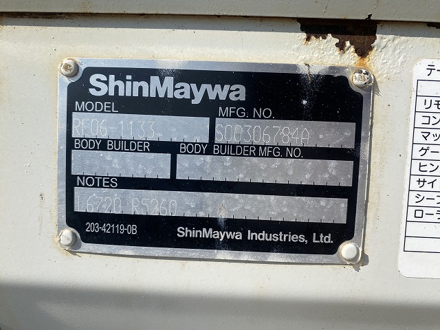 メーカー完成車 木製5方開 床シマ銅板張 2重アオリ 高さ2重アオリから770mm、アオリから370mm 新明和製RE06-1133型 垂直ゲート(600KG) バックモニター 両電格ミラー キーレス付