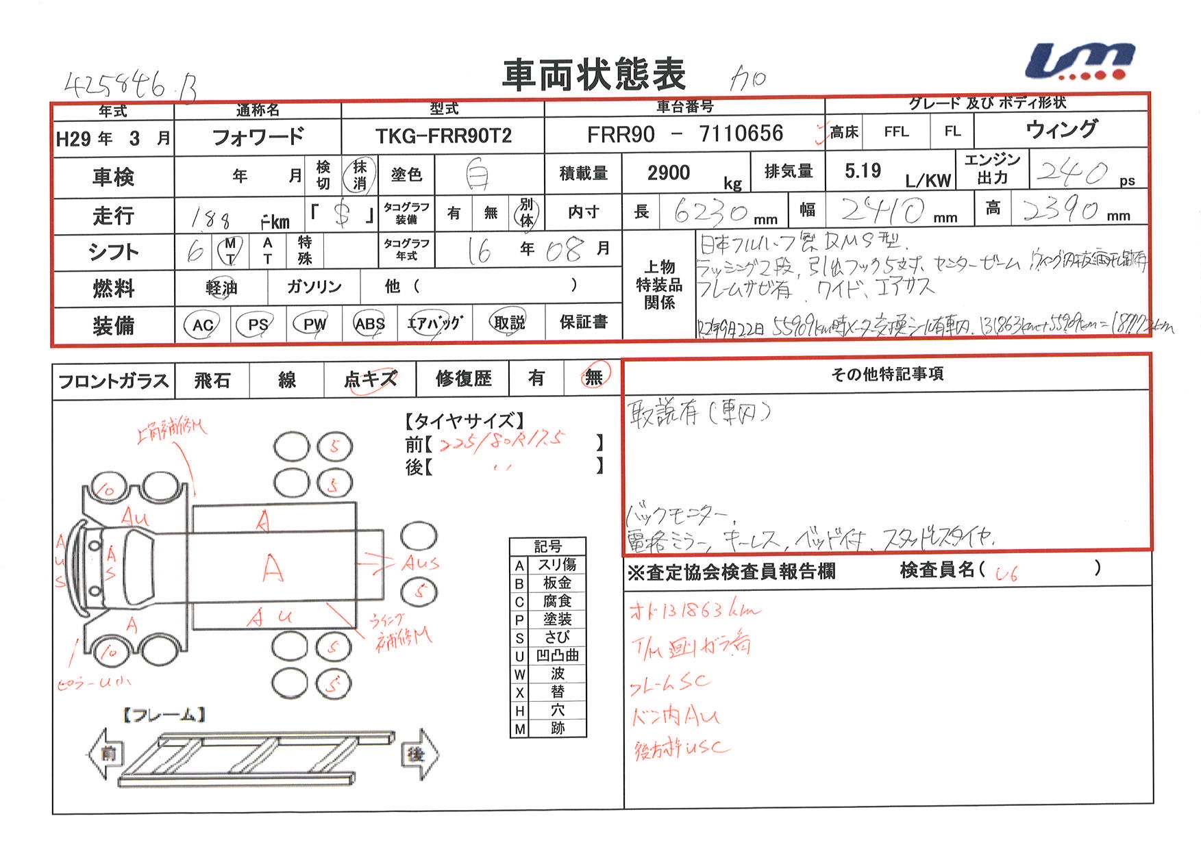 日本フルハーフ製DMS型 アルミウィング ラッシング2段 ウィング内板雨干し跡有 フレーム錆有 ワイド R2年9月22日55909KM時メーター交換シール有(車内)131863KM+55909KM=187772KM 取説有 バックモニター キーレス ベッド付 スタッドレスタイヤ