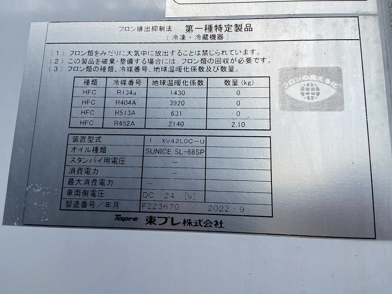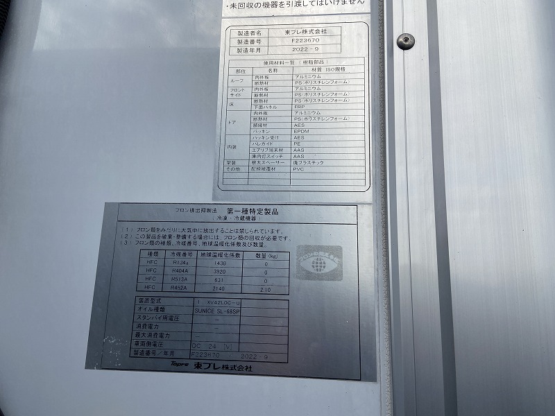 東プレ製XV42L0C-U型 上物2022年9月 E/G始動後1h⇒1℃~-14℃確認 ラッシング2段 床システムフロア サイドドア 水抜き:前2箇所 後2箇所 新明和製格納PG(1000Kg)電格ミラー ベッドレス エアサス バックモニター